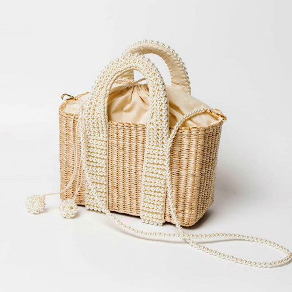 Fashion pearls adorn the handle on this gorgeous Summer bag. Woven delight. Select from to styles.